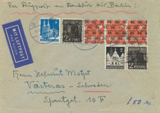 Ein Auslandsbrief (30 PF.) mit Inlandsluftpost (5 Pf.) ergibt 35 Pfennig. Es sind bisher nur wenige Exemplare aufgetaucht. In Mischfrankatur mit Band/Netzaufdruck nur 19 Tage möglich!