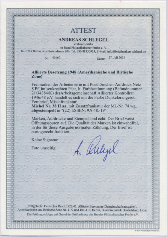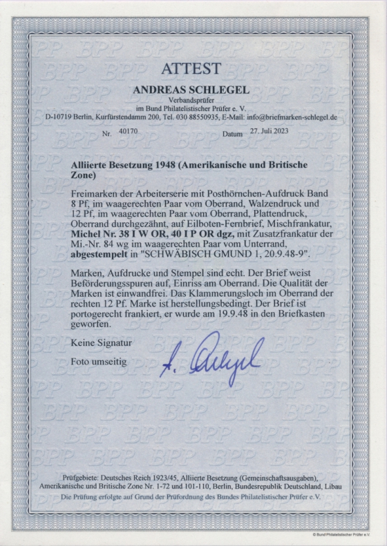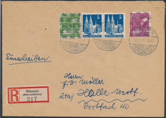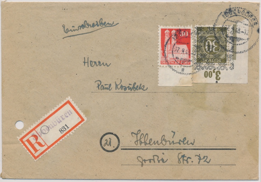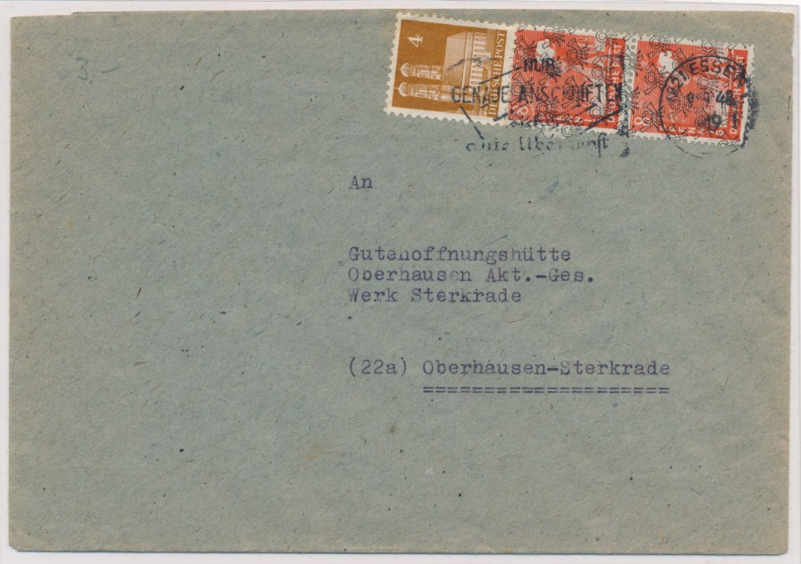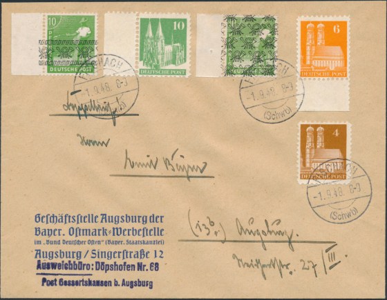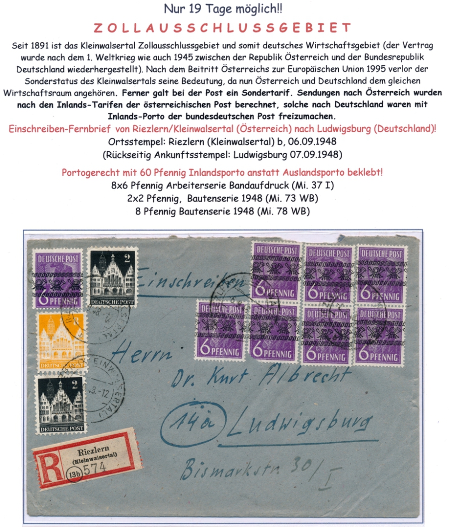 Der Brief wurde am 19.09.48 in den Briefkasten geworfen und war aufgrund der letzten Kastenleerung am 20.09.48 in der früh daher noch portogerecht."Last-Day Beleg!!