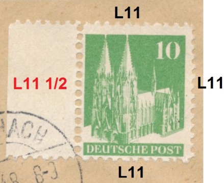 Und eine seltene einseitige Mischzähnung 11:11:11:11:1/2 der 10 Pfennig Bauten (Mi. 80I WP)