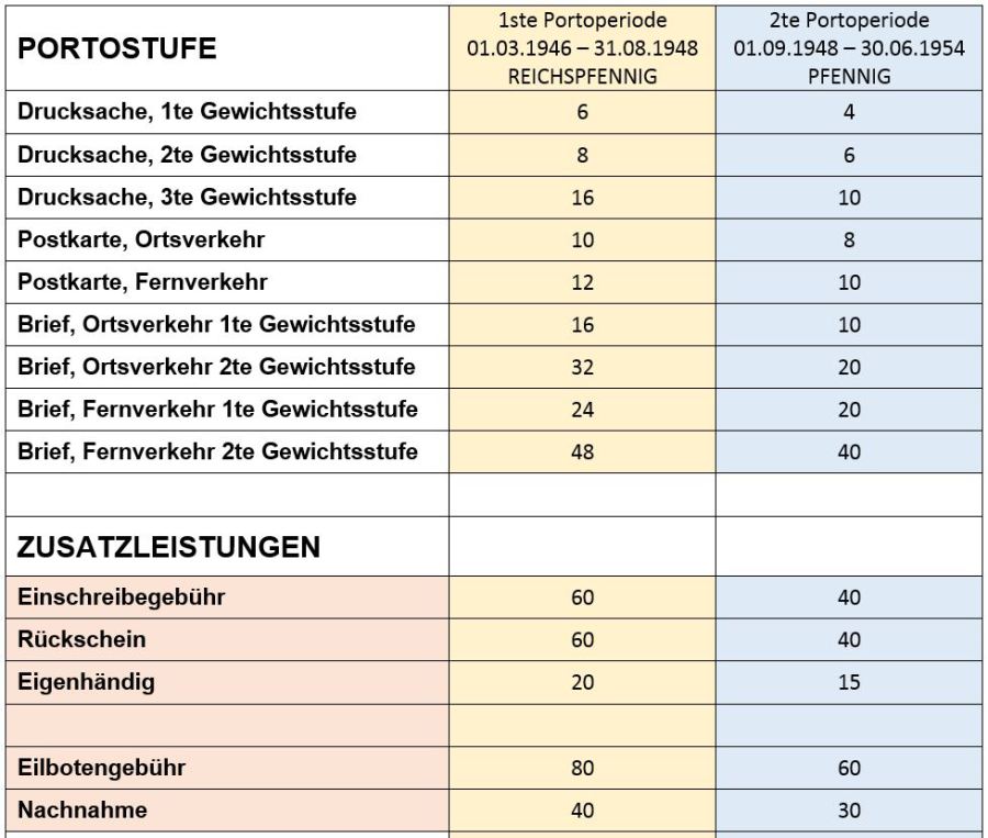 Hier eine kleine Tabelle mit den gängigsten Portostufen in der alten Portoperiode (01.03.1946 - 31.08.1948) und der neuen Portoperiode (01.09.1948 - 30.06.1954):
