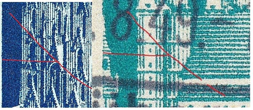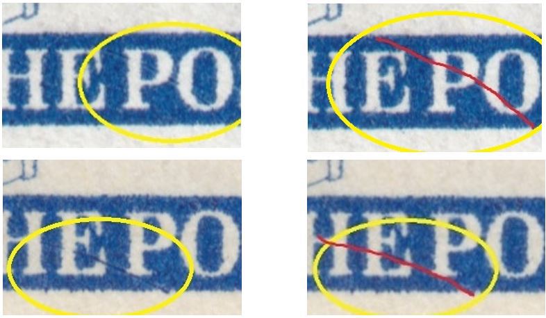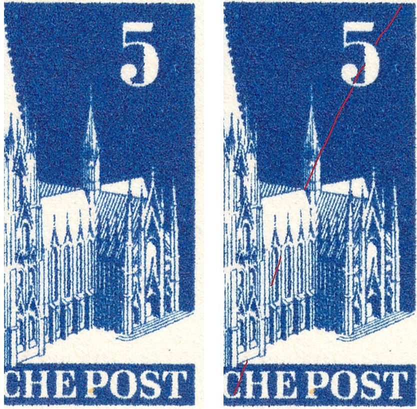 Damit war klar, dass es Beschädigungen in Form von schmalen Kratzern am Gummituch waren. Warum diese nicht hell waren, so wie die üblichen GTFs, ist mir auch schnell klar geworden. Man stelle sich eine schmale Vertiefung an einem Gummituch vor, ähnlich wie mit einem dünnen Messer oder Rasierklinge hineingeschnitten. Wenn dann während des Druckvorganges Farbe auf das Gummituch aufgetragen wird, läuft diese Farbe in diese Schnitte hinein und wird beim Druckvorgang hinausgepresst und ist dann als dunkler Strich auf der Marke sichtbar.