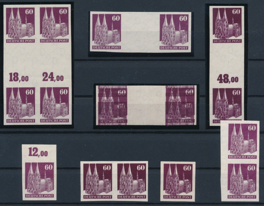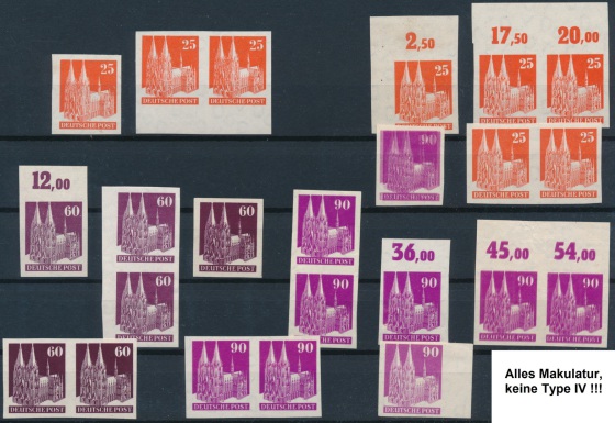 Ausschuß, der beim Druck oder der Perforation entstand, war Makulatur und sollte vernichtet werden. Große Mengen wurden jedoch entwendet und gelangte unberechtigterweise in den Briefmarkenhandel. Es gibt teilweise große Mengen und Bogenteile, die immer wieder fälschlicherweise als ungezähnte Type IV überteuert angeboten wird. Dabei benutzt man oft alte Michel-Preise, obwohl der Michel-Katalog seit ein paar Jahren diese aus dem Katalog herausgenommen hat. Die korrekten Preise, besonders die des Motives Kölner Doms, belaufen sich gerade so um 5-15€...mehr nicht!!